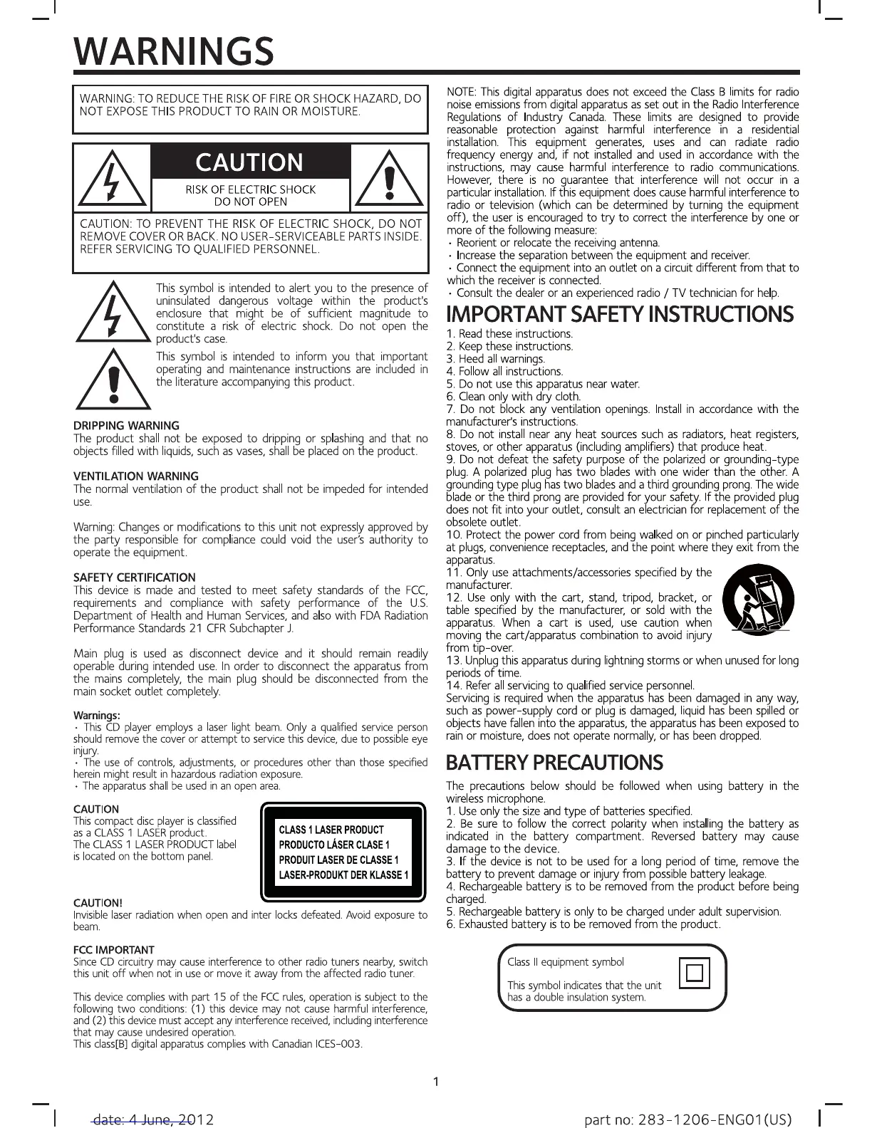 The Singing Machine SML283 - Warnings and Safety Instructions; General Safety Precautions; Important Safety Instructions; Battery Precautions
