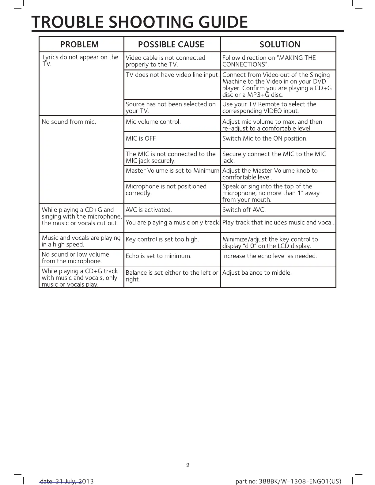 The Singing Machine SML388W - Troubleshooting Playback and Audio; Lyrics and Video Display Issues; Microphone and Audio Interruption