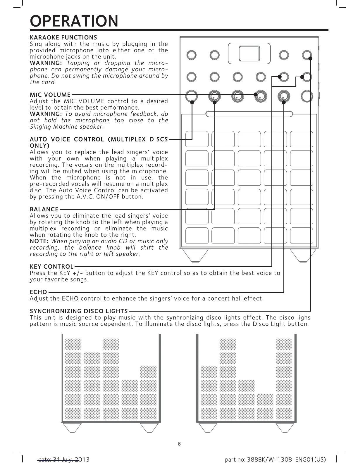 The Singing Machine SML388W - Karaoke and Special Features; Karaoke Microphone Setup; Voice and Sound Adjustment; Synchronizing Disco Lights