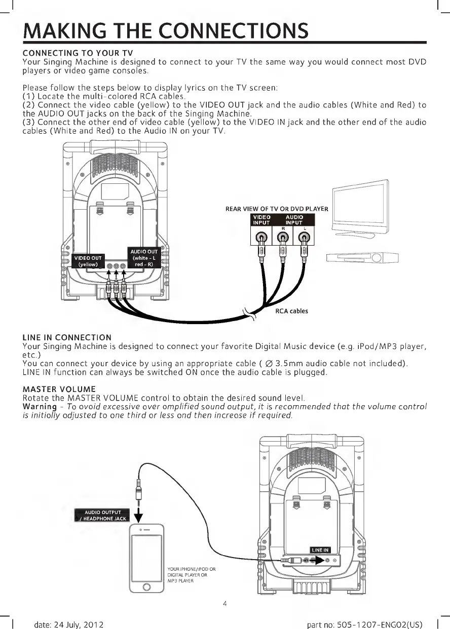 The Singing Machine SML505 - Connecting to TV; Line In Connection; Master Volume Adjustment
