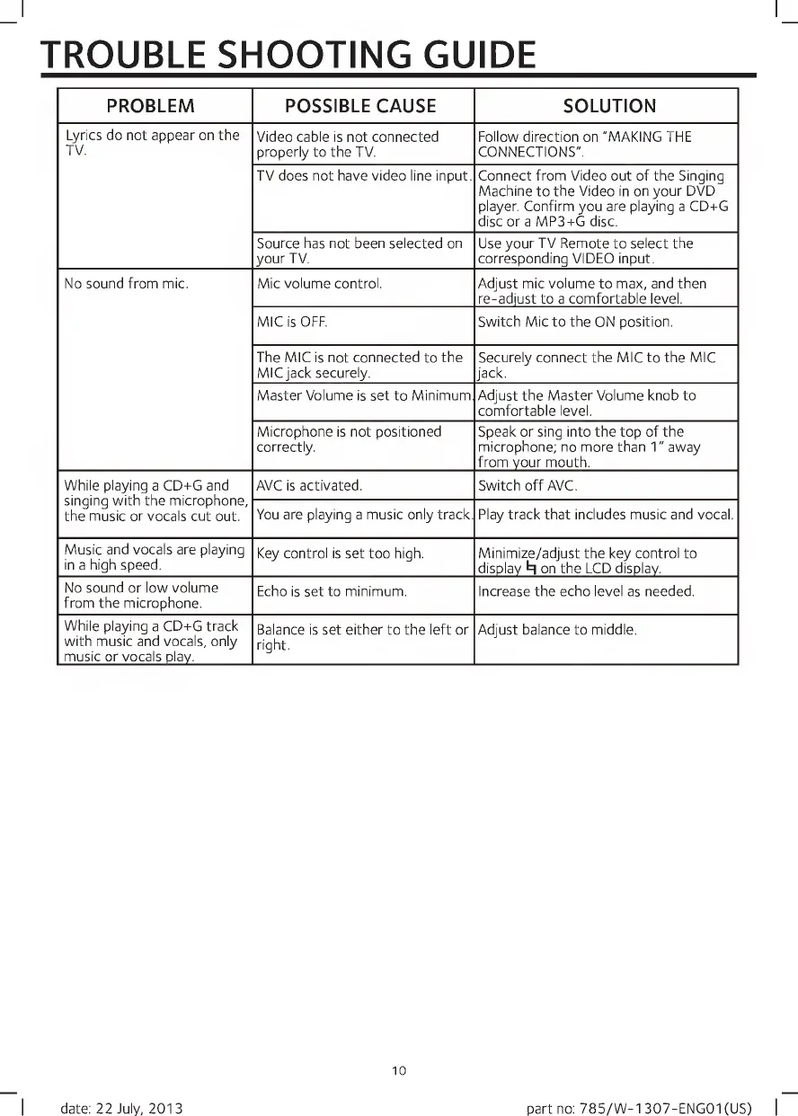 The Singing Machine STVG785 - Troubleshooting Specific Features; Lyrics and Microphone Problems; Playback and Vocal Issues