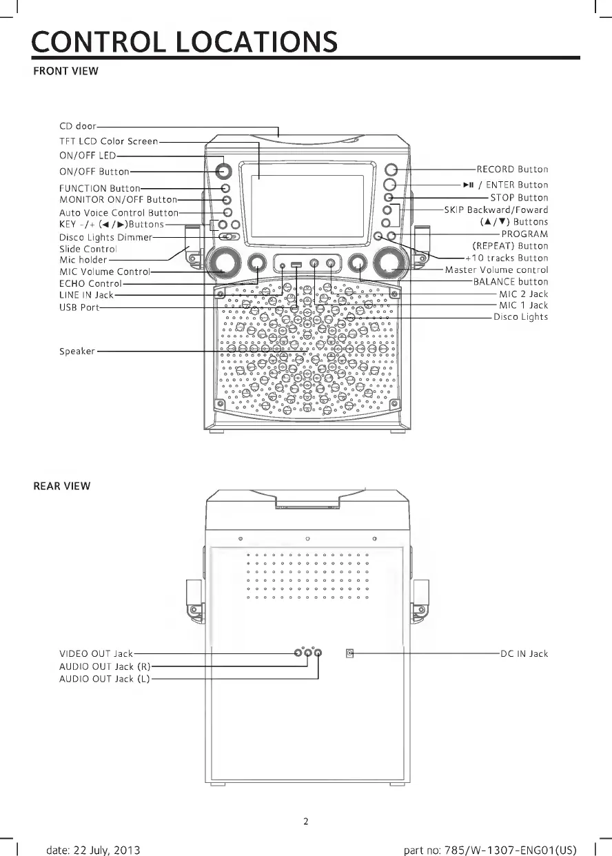 The Singing Machine STVG785 - Control Locations; Front View Controls; Rear View Ports