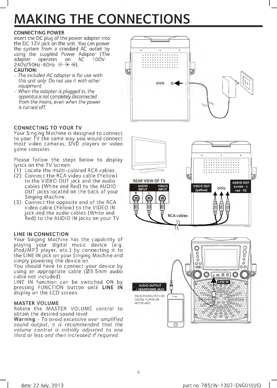 The Singing Machine STVG785 - Making the Connections; Connecting Power; Connecting to Your TV; Line In Connection