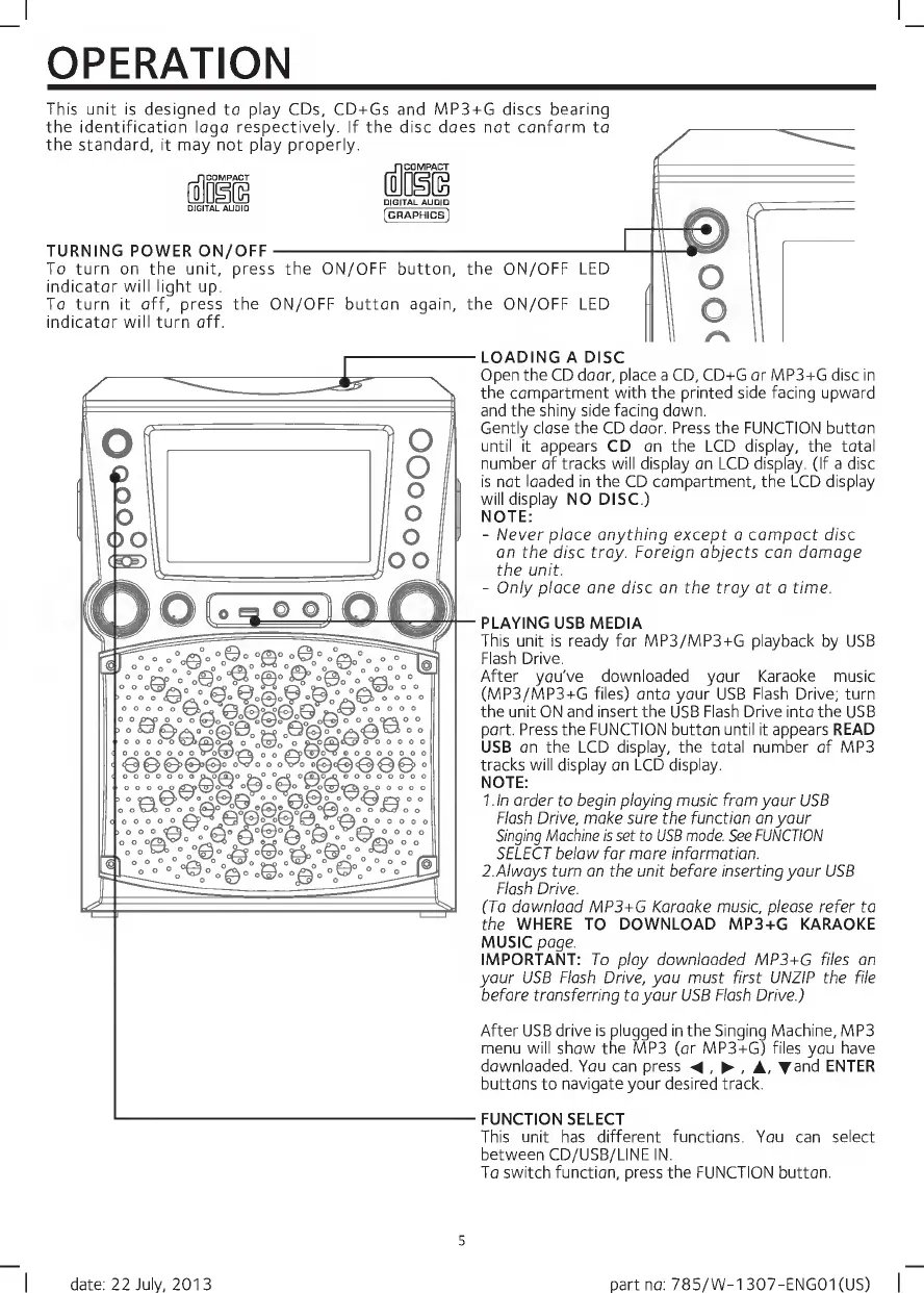 The Singing Machine STVG785 - Unit Operation; Powering On and Off; Loading and Playing Discs; Playing USB Media