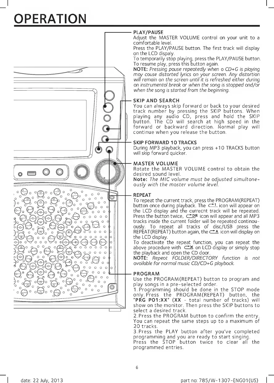 The Singing Machine STVG785 - Playback Controls; Play, Pause, and Skip Functions; Repeat and Program Modes