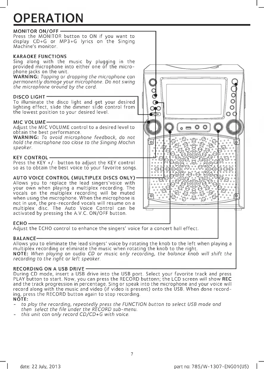 The Singing Machine STVG785 - Karaoke and Audio Features; Microphone and Vocal Controls; Disco Light Control; Recording to USB