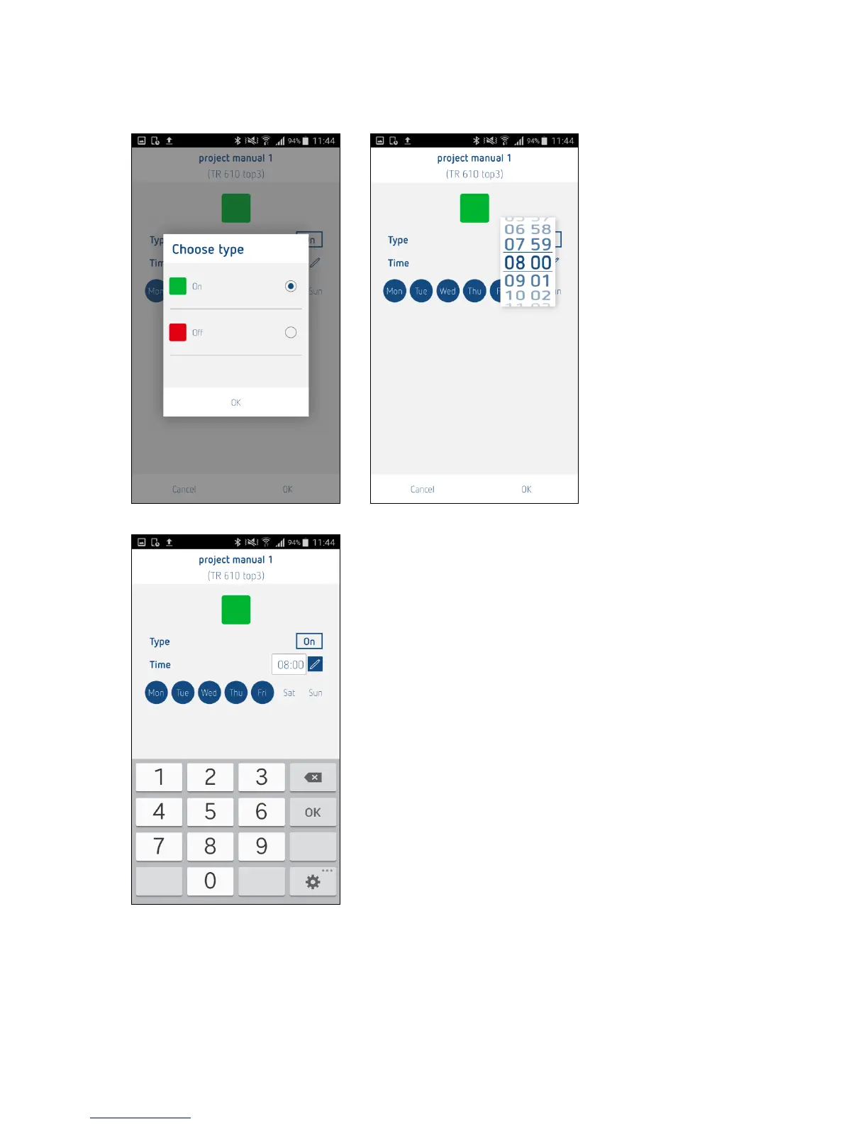 Enter the parameters (type, time, week day). The switching time can be entered either via the time