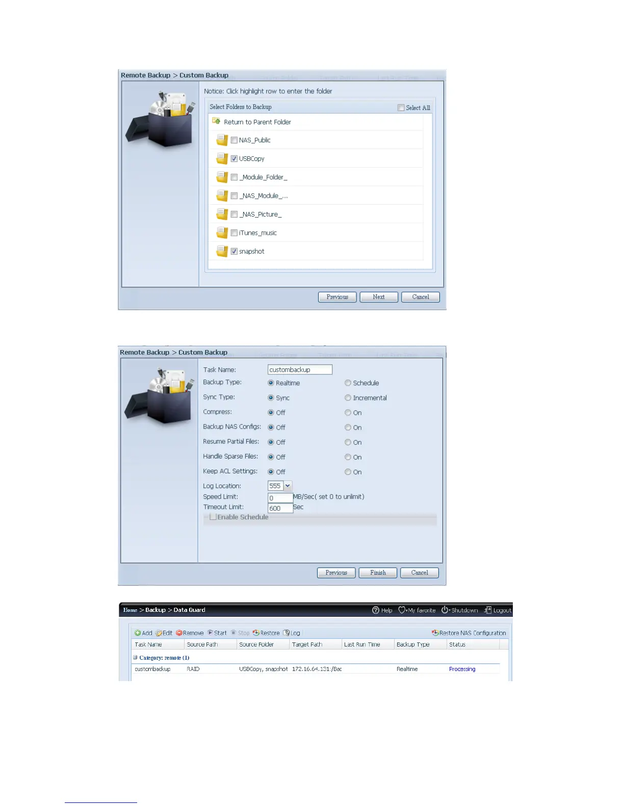 From the task list, you can now see the newly added customback01. This backup