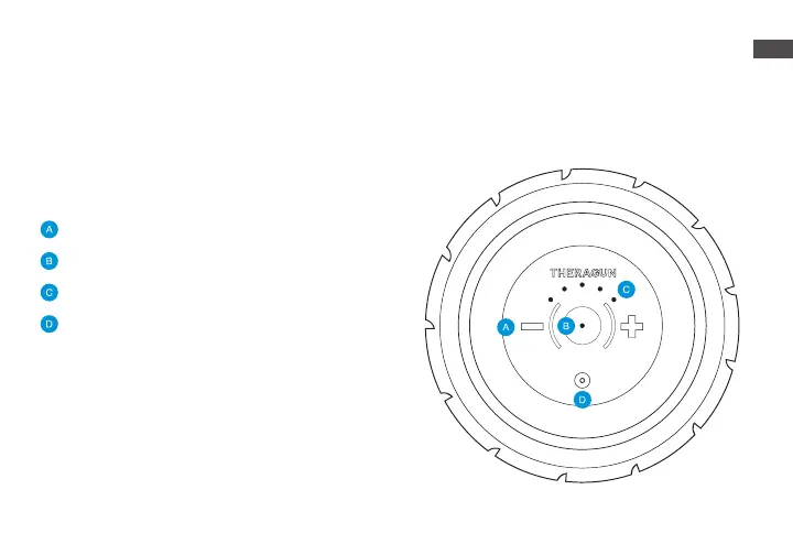THERAGUN Wave Roller - Wave Roller Components; Speed Control Buttons (A); LED Battery Indicator (B); LED Speed Indicator (C)
