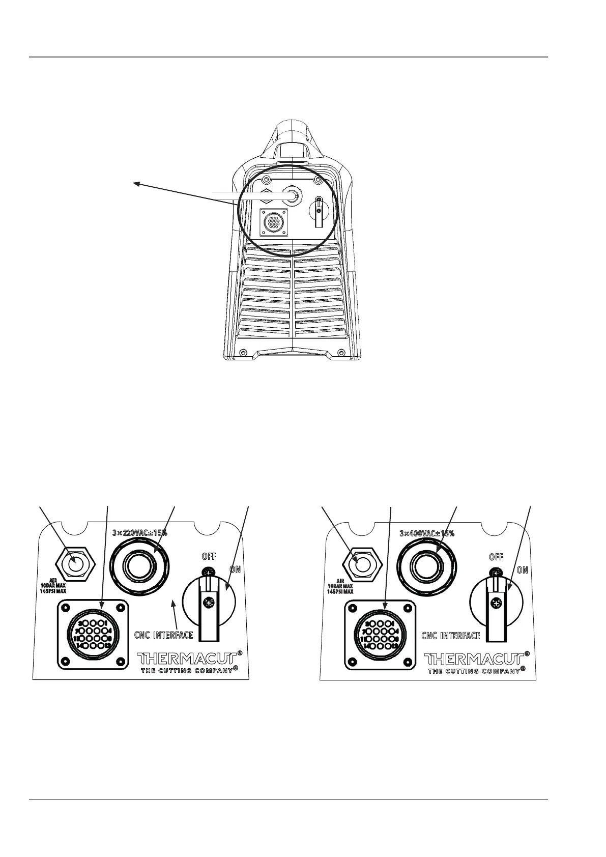 THERMACUT EX-TRAFIRE 55SD - Operation - Rear View and Controls; Rear View of the Unit; Rear Control Panel Details