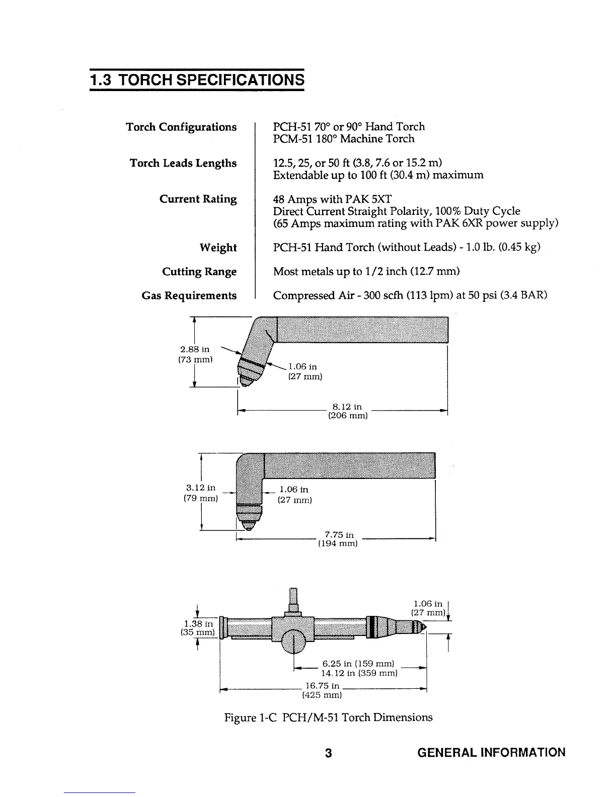 Thermal Arc PAK 5XT - TORCH SPECIFICATIONS