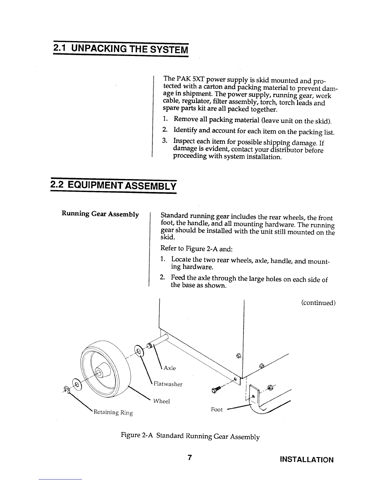 Thermal Arc PAK 5XT - INSTALLATION; UNPACKING THE SYSTEM; EQUIPMENT ASSEMBLY