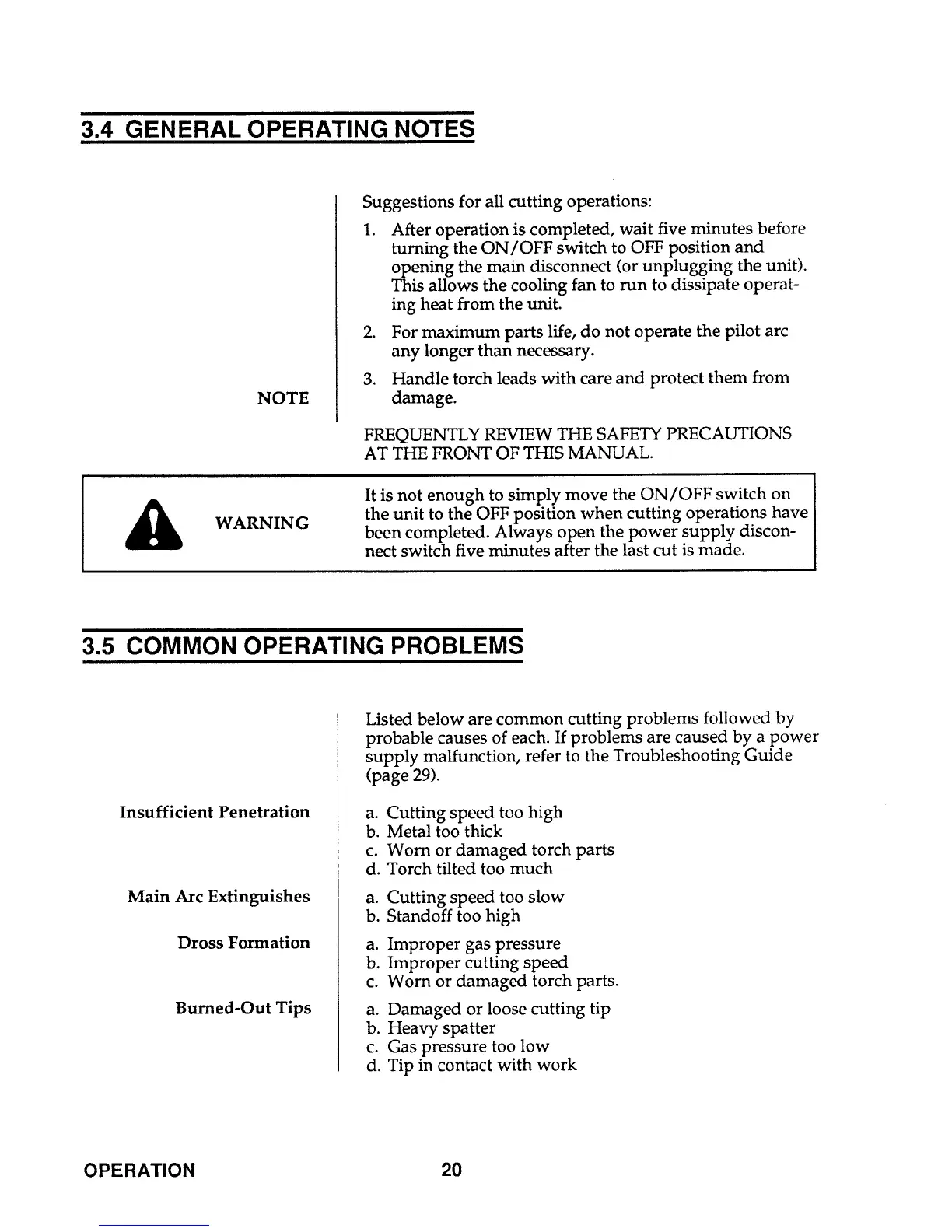 Thermal Arc PAK 5XT - GENERAL OPERATING NOTES; COMMON OPERATING PROBLEMS