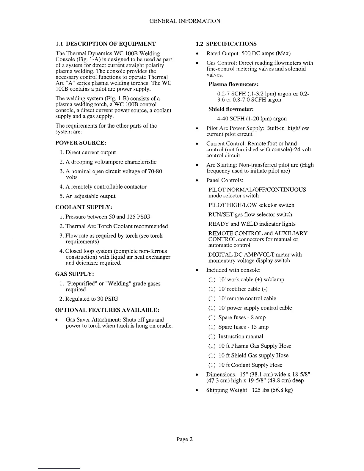 Thermal Arc WC100B - Description of Equipment; Power Source; Specifications