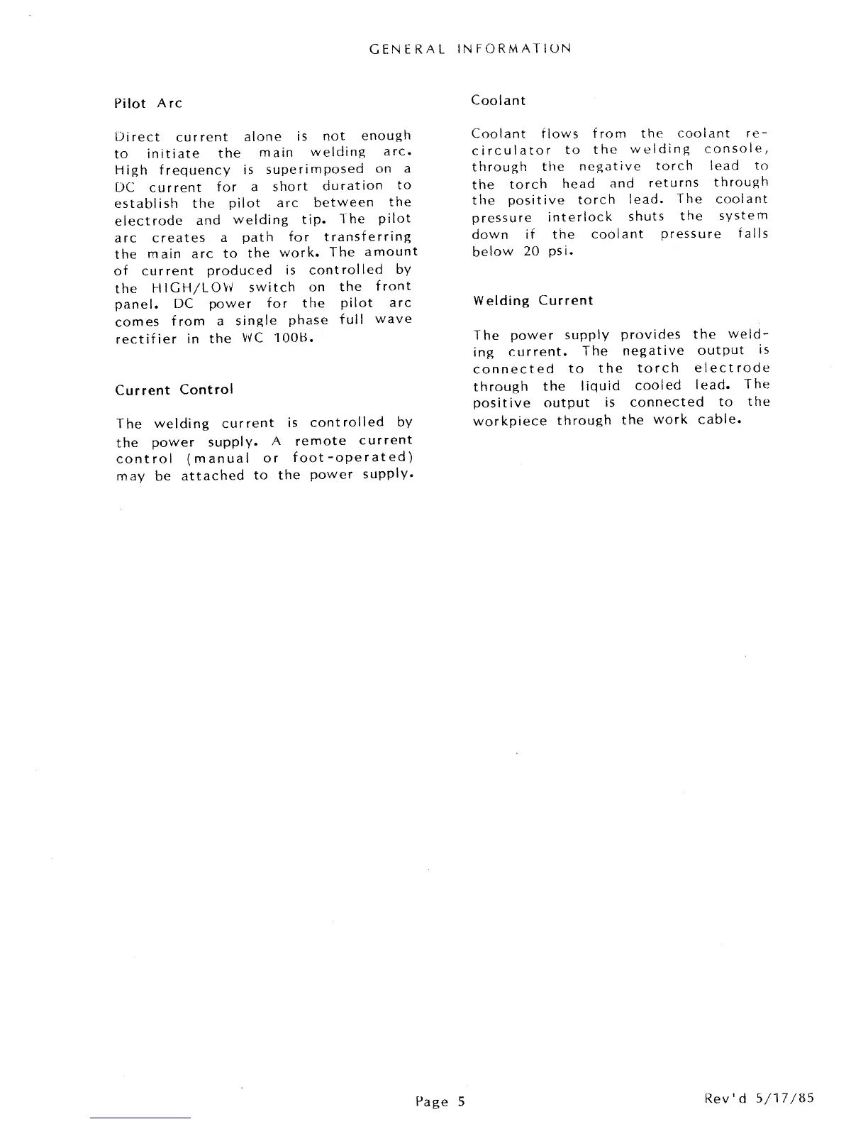 Thermal Arc WC100B - Pilot Arc; Current Control; Coolant; Welding Current