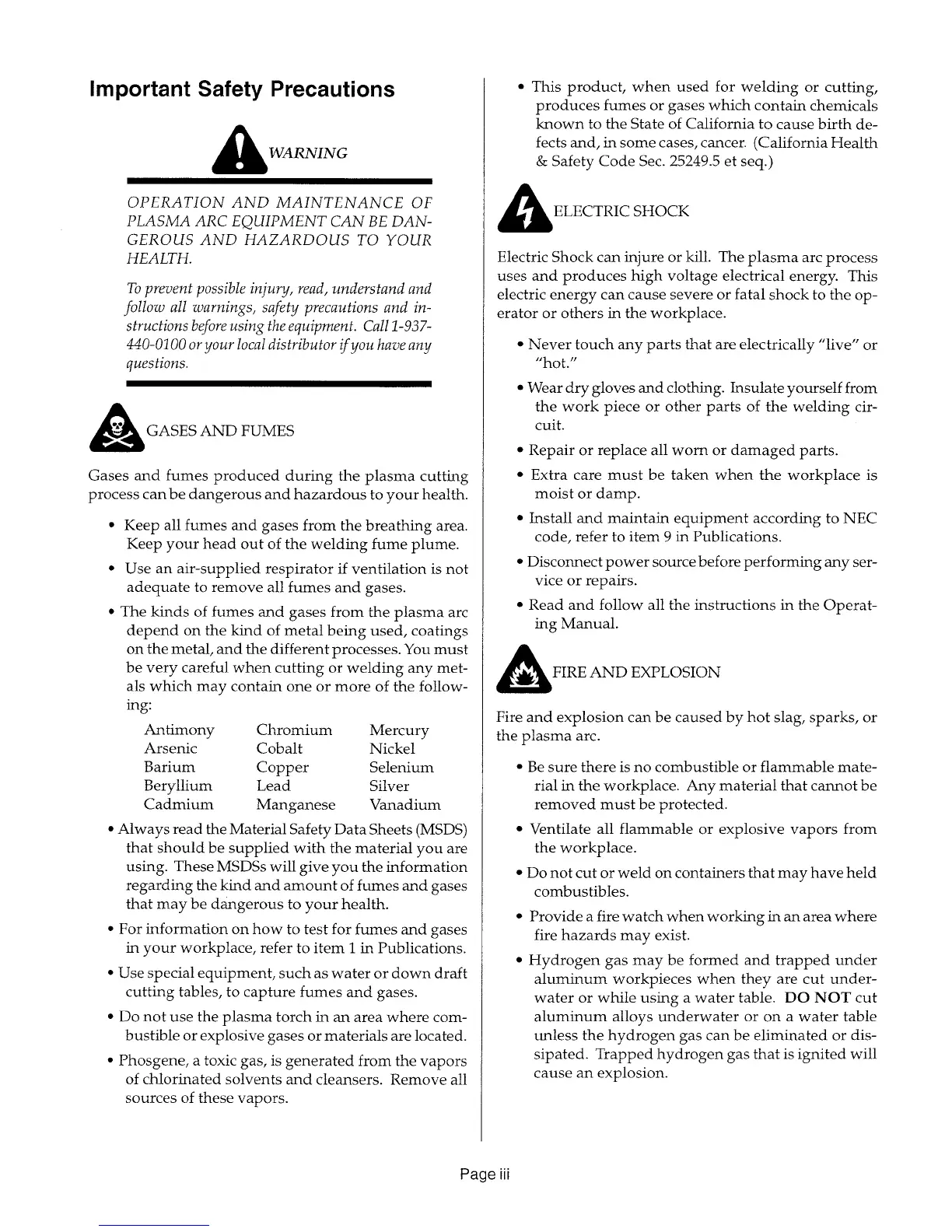 Thermal Arc WC100B - Safety Precautions; Gases and Fumes Hazards; Electric Shock Hazards; Fire and Explosion Hazards