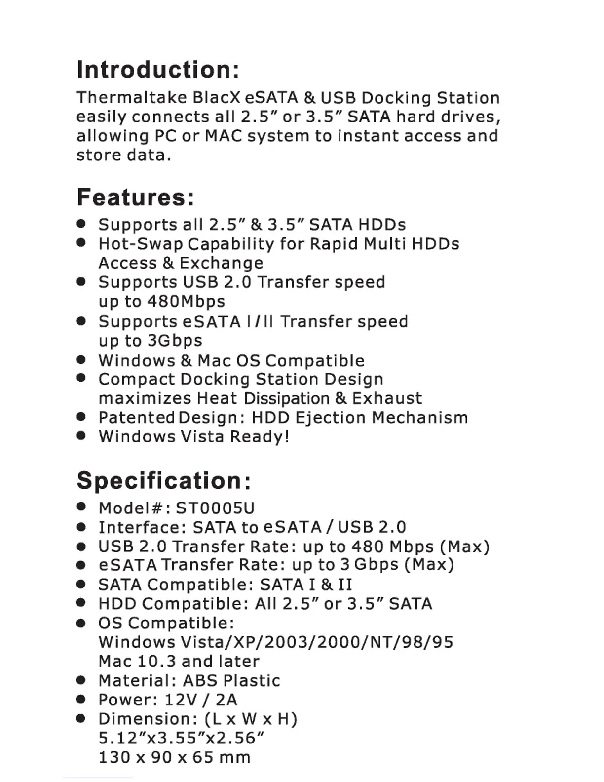 Thermaltake ST005U - Product Features; Product Specifications