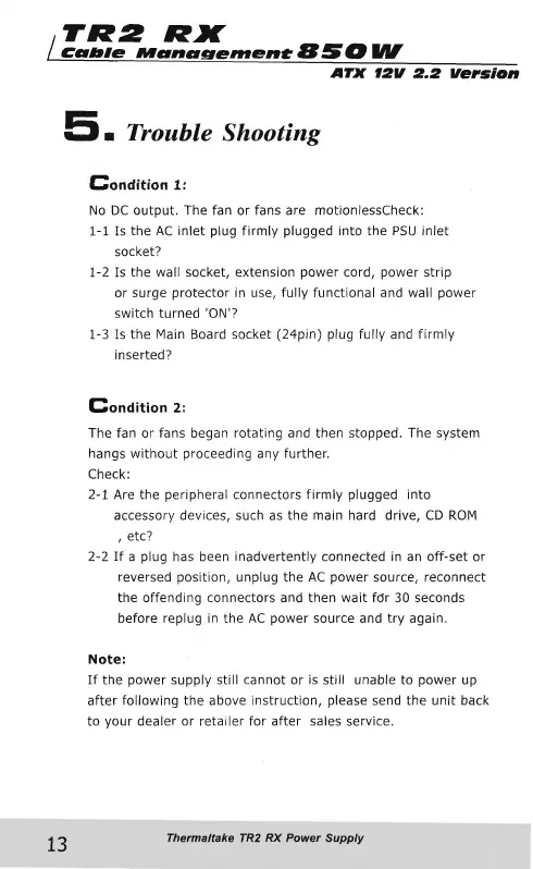 Thermaltake TR2 RX - Troubleshooting; No DC Output; Fan Stops and System Hangs