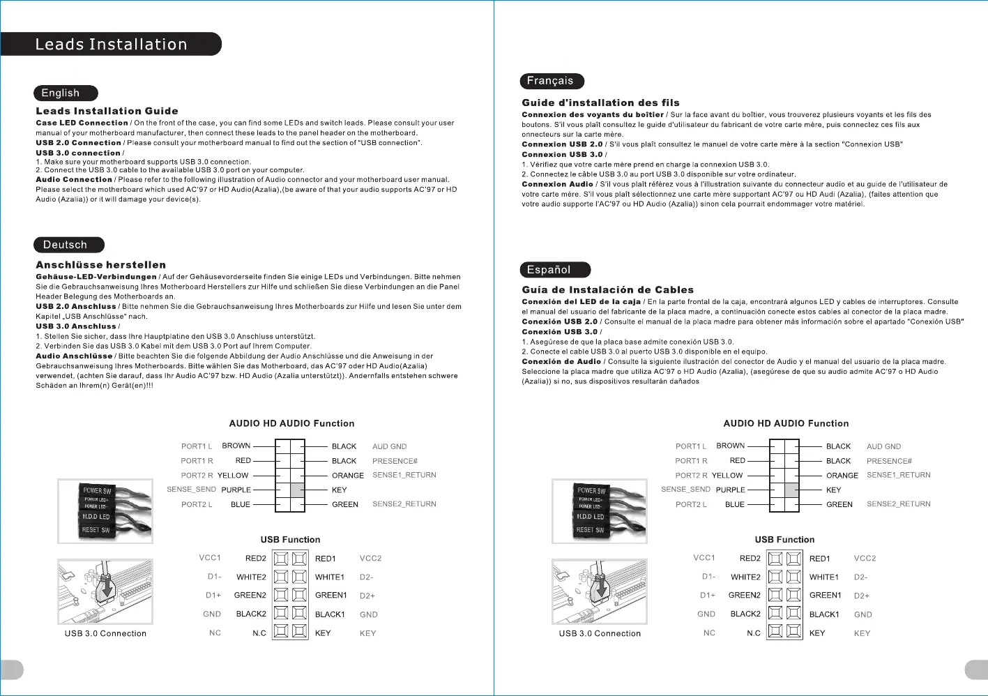 Thermaltake V100 - Front Panel Leads Installation; Case LED and Switch Connections; USB 2.0 Front Panel Connection; USB 3.0 Front Panel Connection
