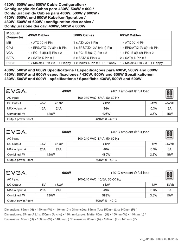 Thermaltake Versa H18 - 430 W, 500 W and 600 W Cable Configuration; 430 W, 500 W and 600 W Specifications