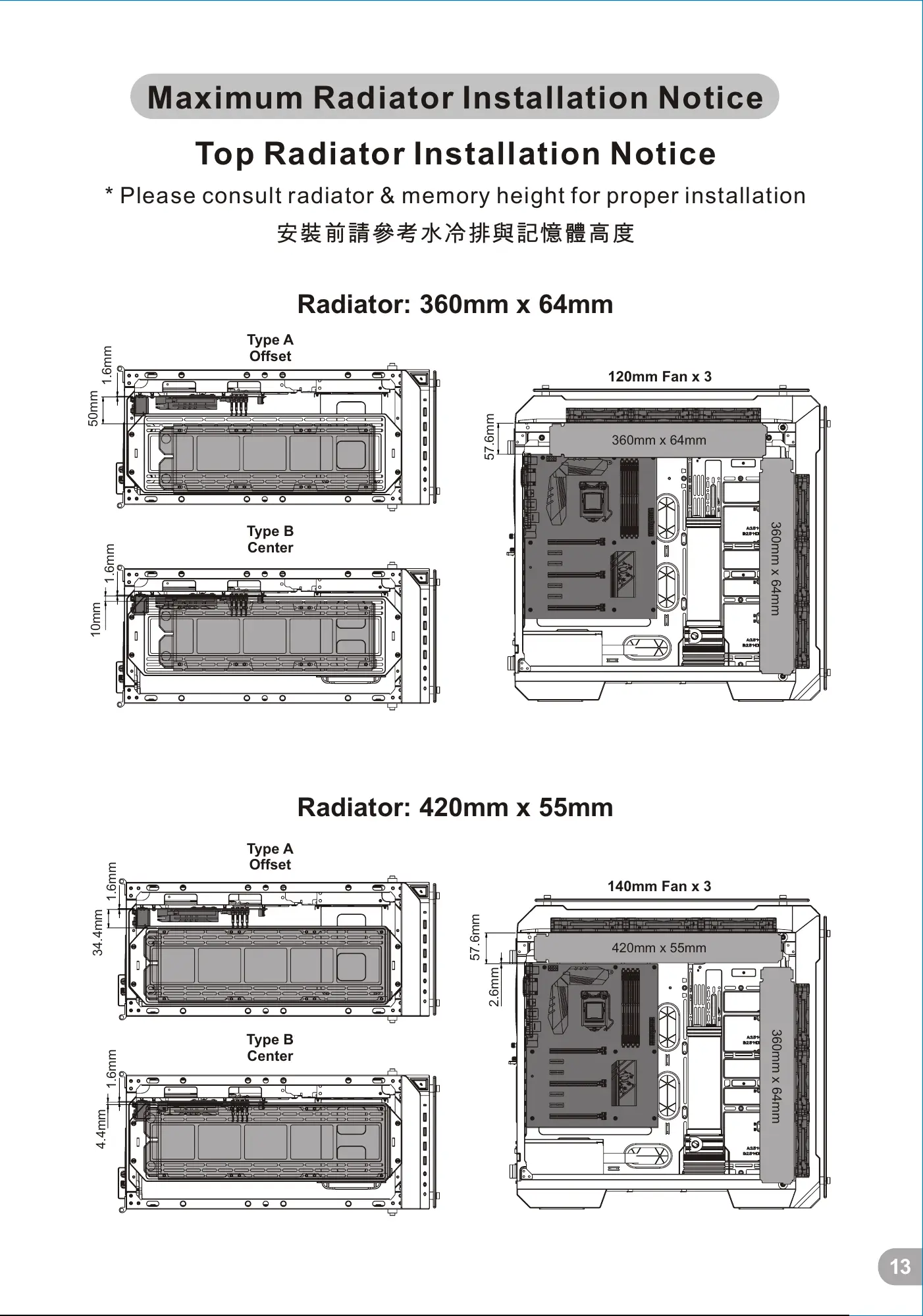 安裝前請參考水冷排與記憶體高度