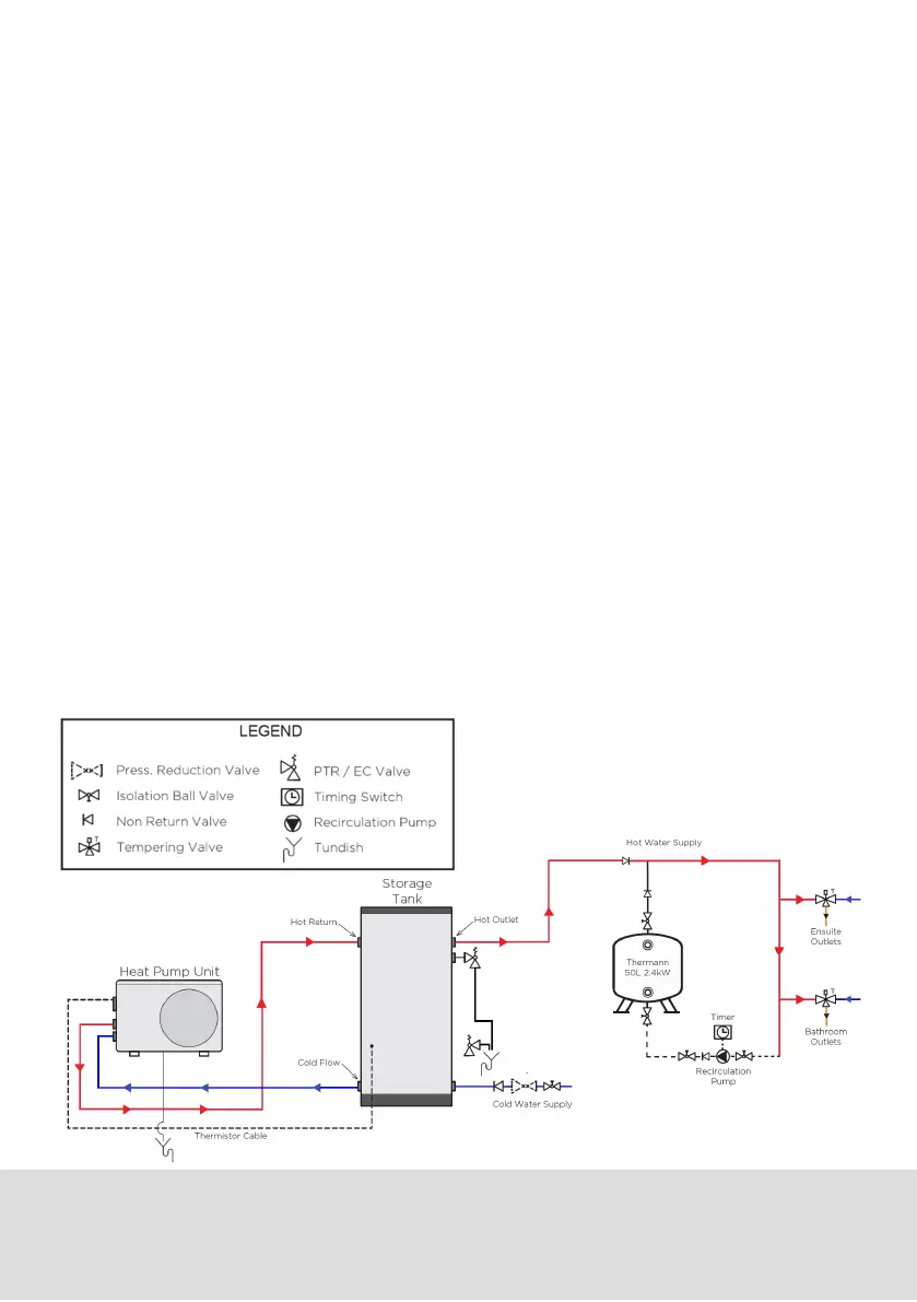 Note: Minimise the length of pipe work connecting the heat pump storage tank hot water