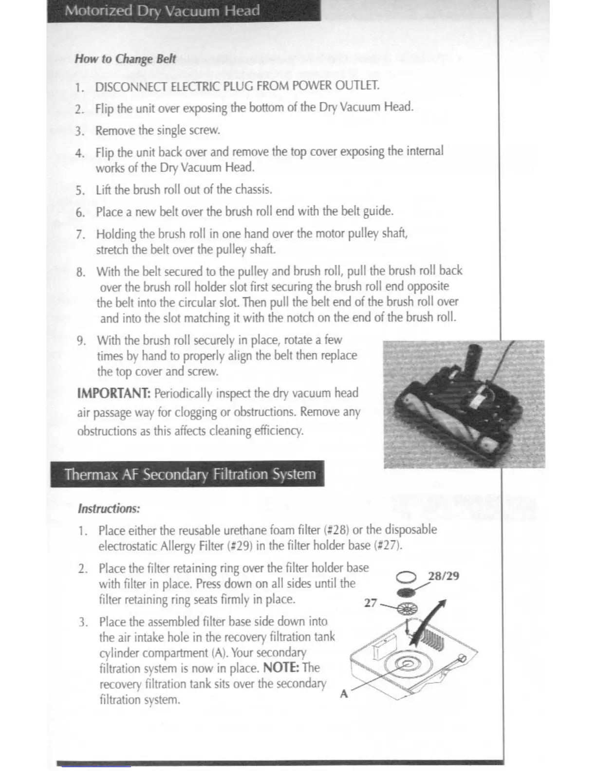 Thermax AF - Motorized Dry Vacuum Head; How to Change Belt; Thermax AF Secondary Filtration System