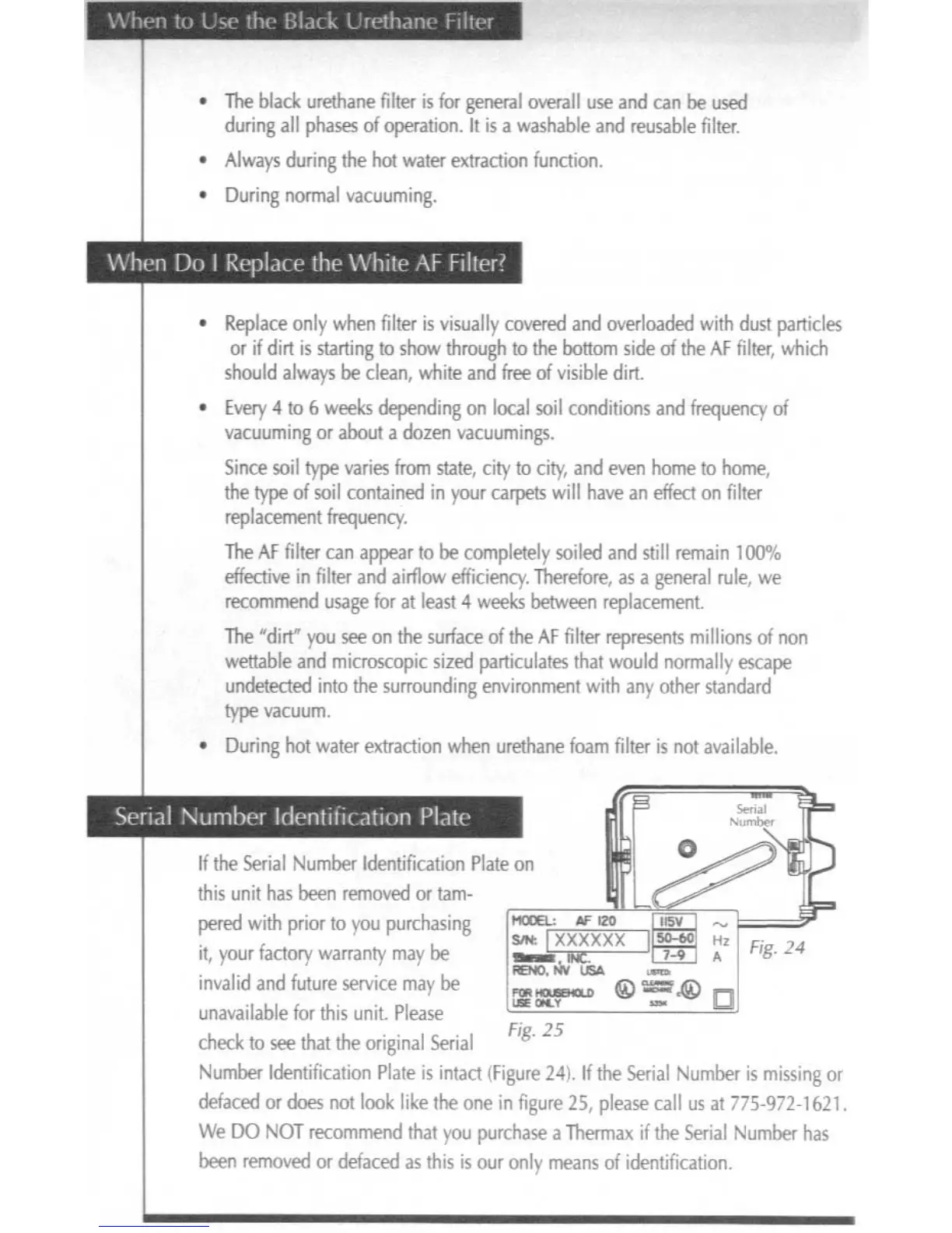Thermax AF - When to Use the Black Urethane Filter; When Do I Replace the White AF Filter?; Serial Number Identification Plate
