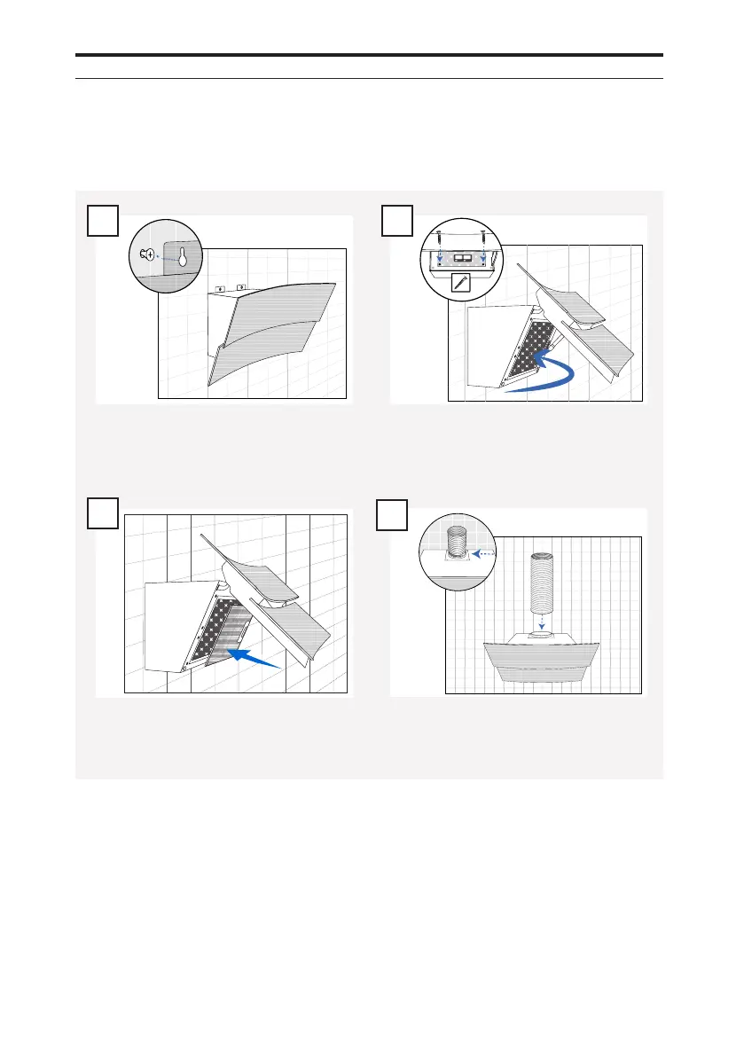 Vaihda kuvun suodatin ja sulje lasi. Kiinnitä hormi kupuun.