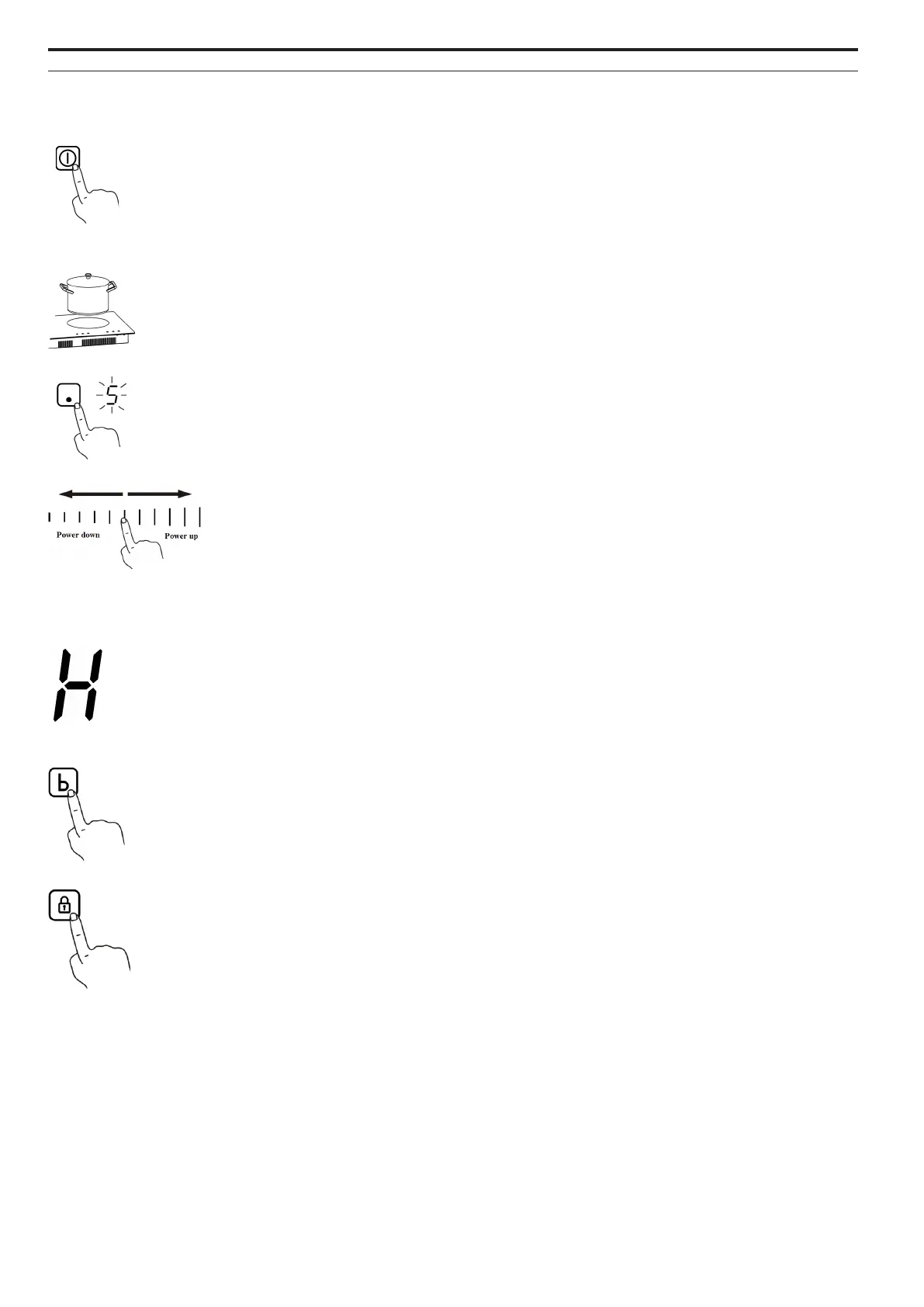 Trykk på ON / OFF-knappen for å aktivere koketoppen. Alle indikatorer viser nå ”-”