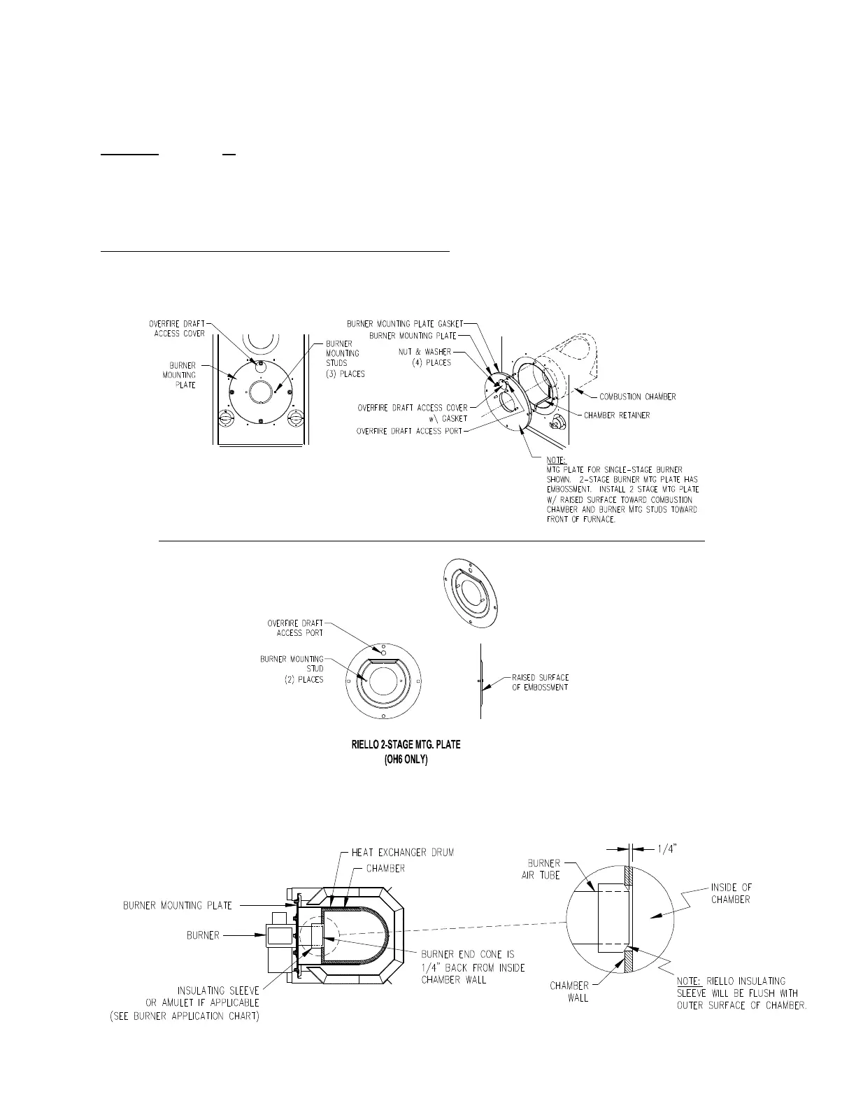 The oil burner will mount on three stud mounting bolts on the lower mounting plate covering the opening