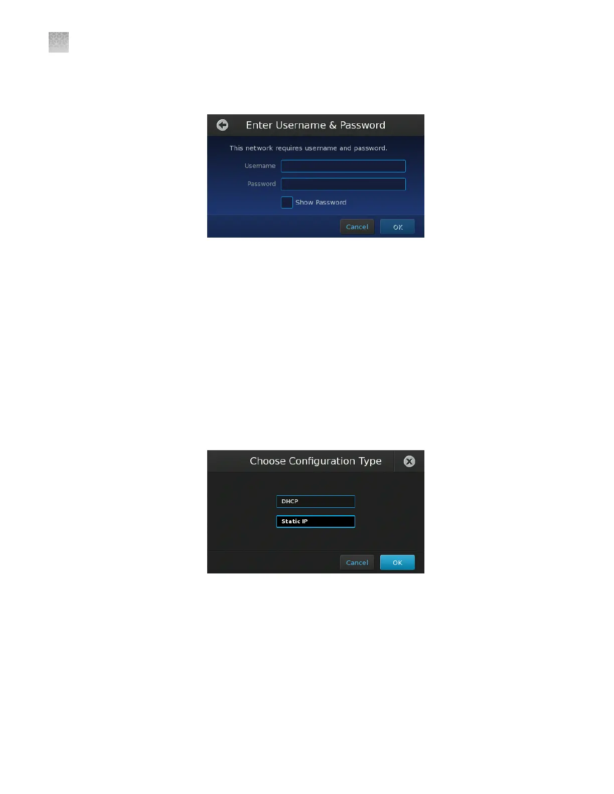 setting appropriate for your network (Static IP or DHCP), then touch OK.