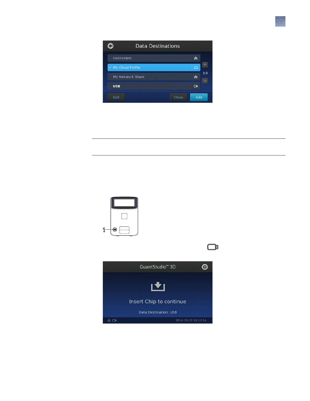 If you selected USB in the Data Destinations screen (as described above), insert