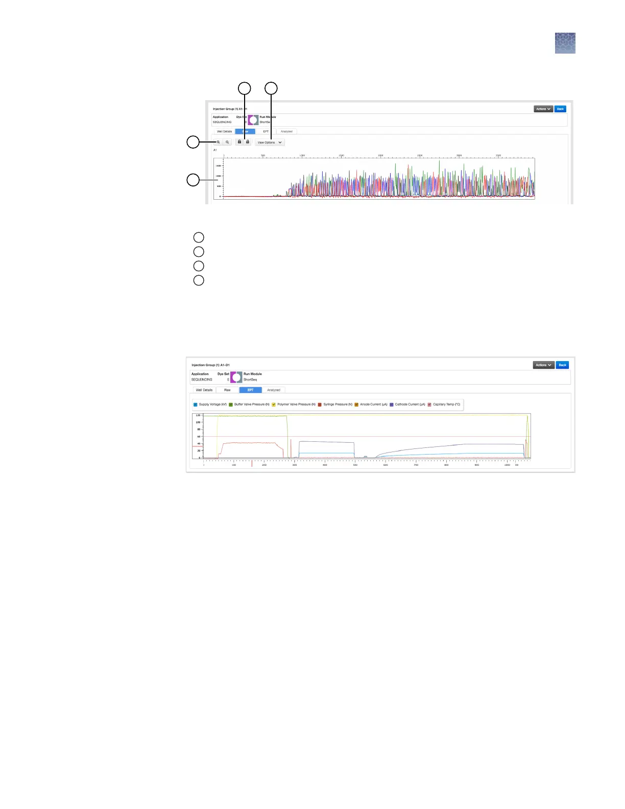 (currents, temperatures, electrophoresis voltage) as a function of time.