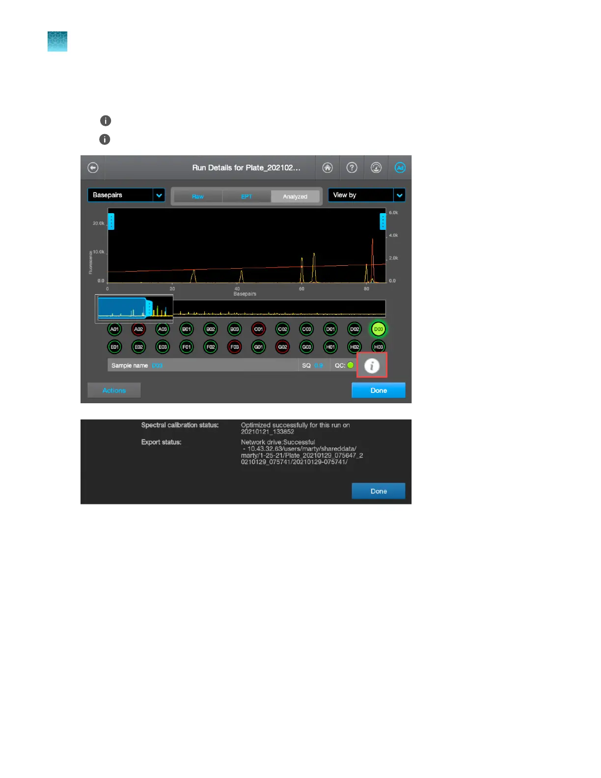 The software reports the status of auto-spectral calibration in the well details screen for each sample