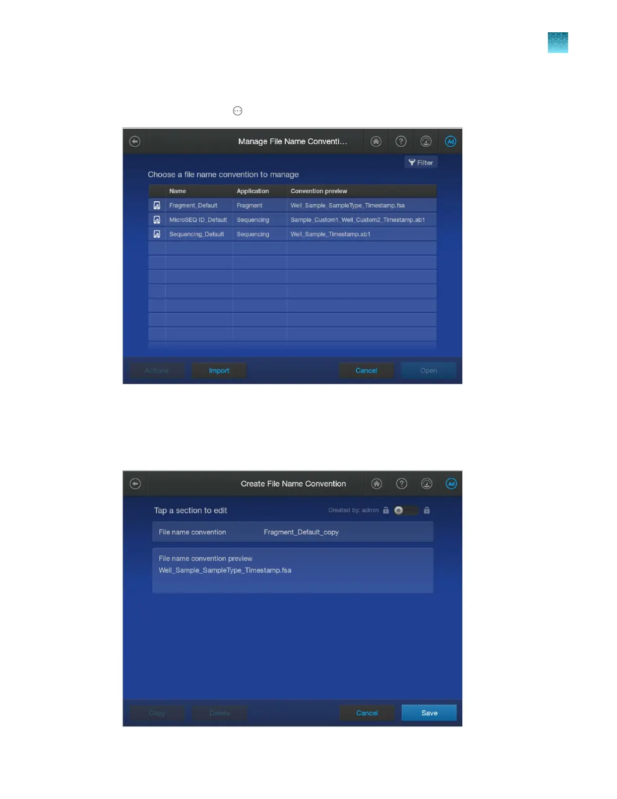 In the home screen, tap Actions4Library4File name conventions.