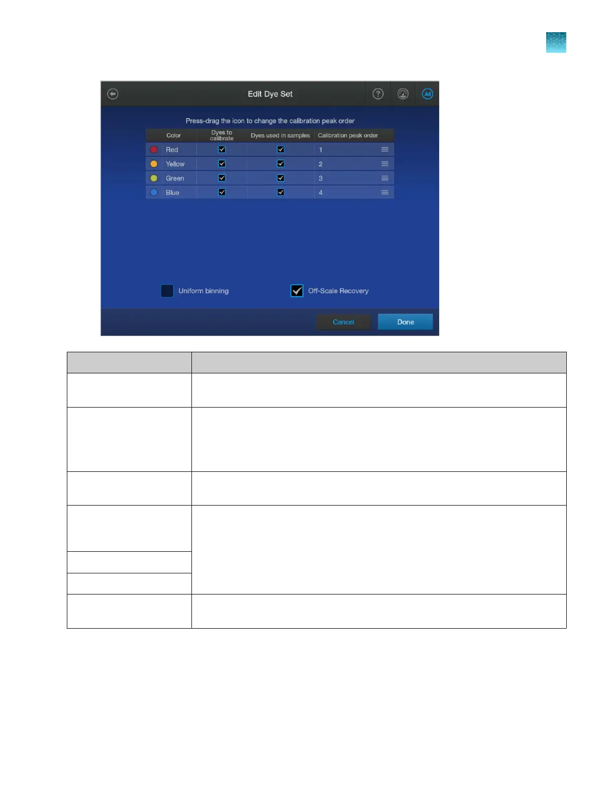Displays the dyes and the peak order for the dye set.