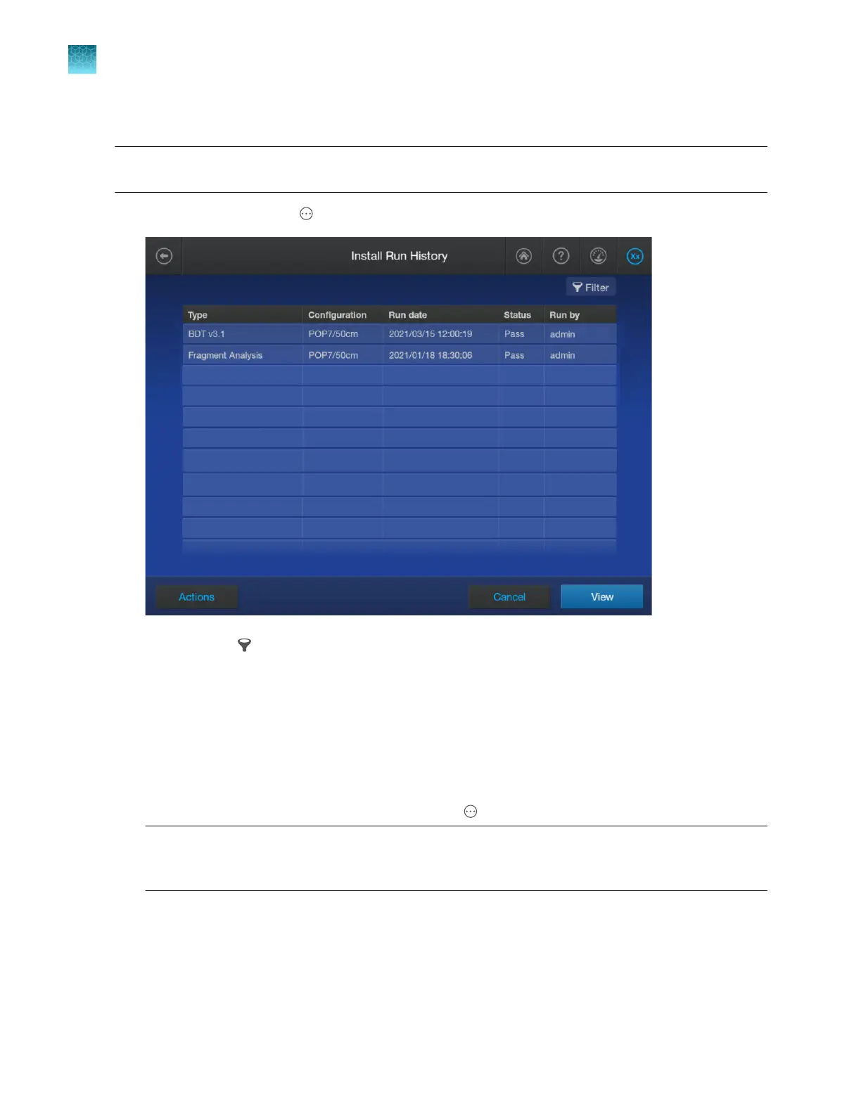 In the home screen, tap Actions4Maintenance4Install run4Install run history.