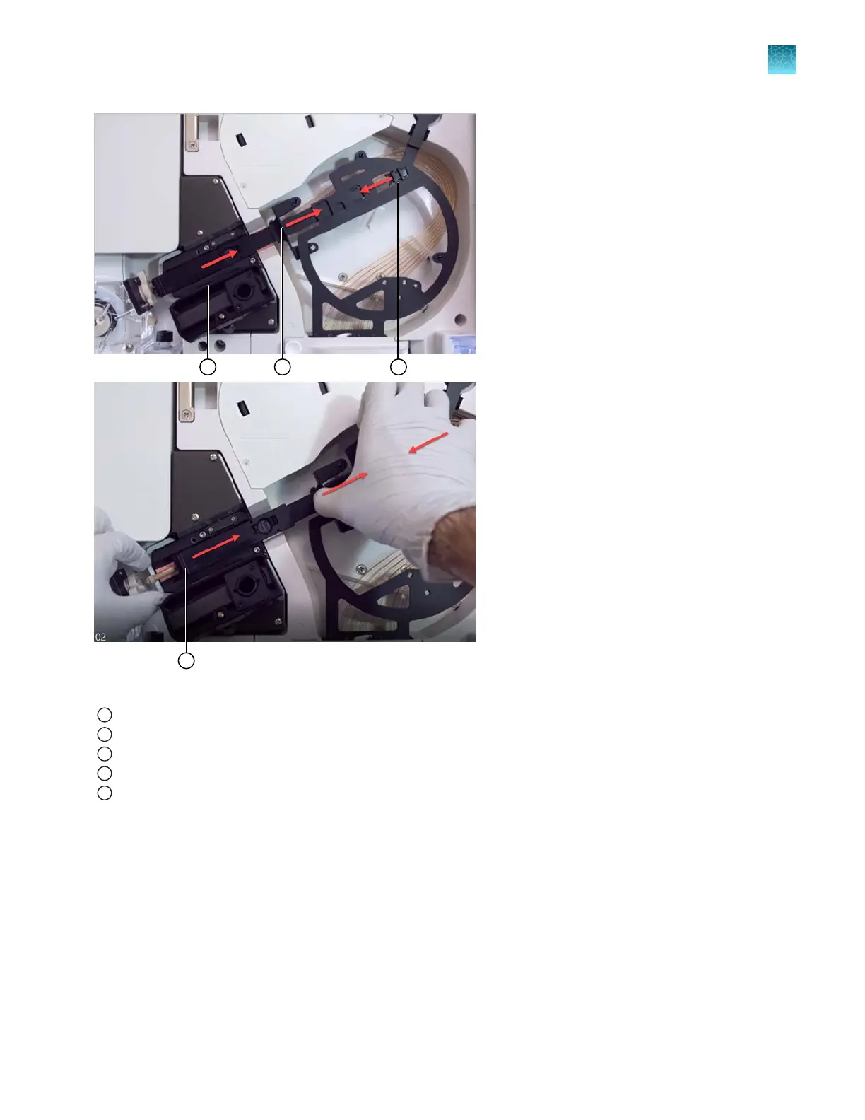 Retractable end of capillary array that protects the tip (slides to the right when you squeeze tab 1 and tab 2 toward each other)