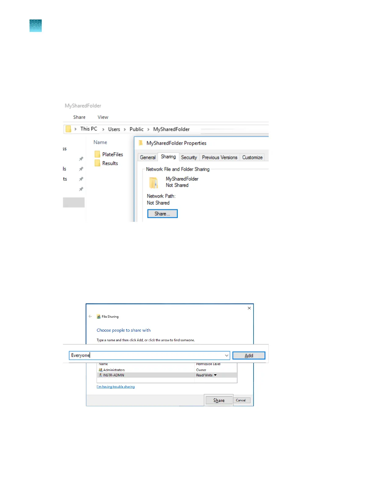 Create subfolders in the MySharedFolder folder. Example: PlateFiles and Results.