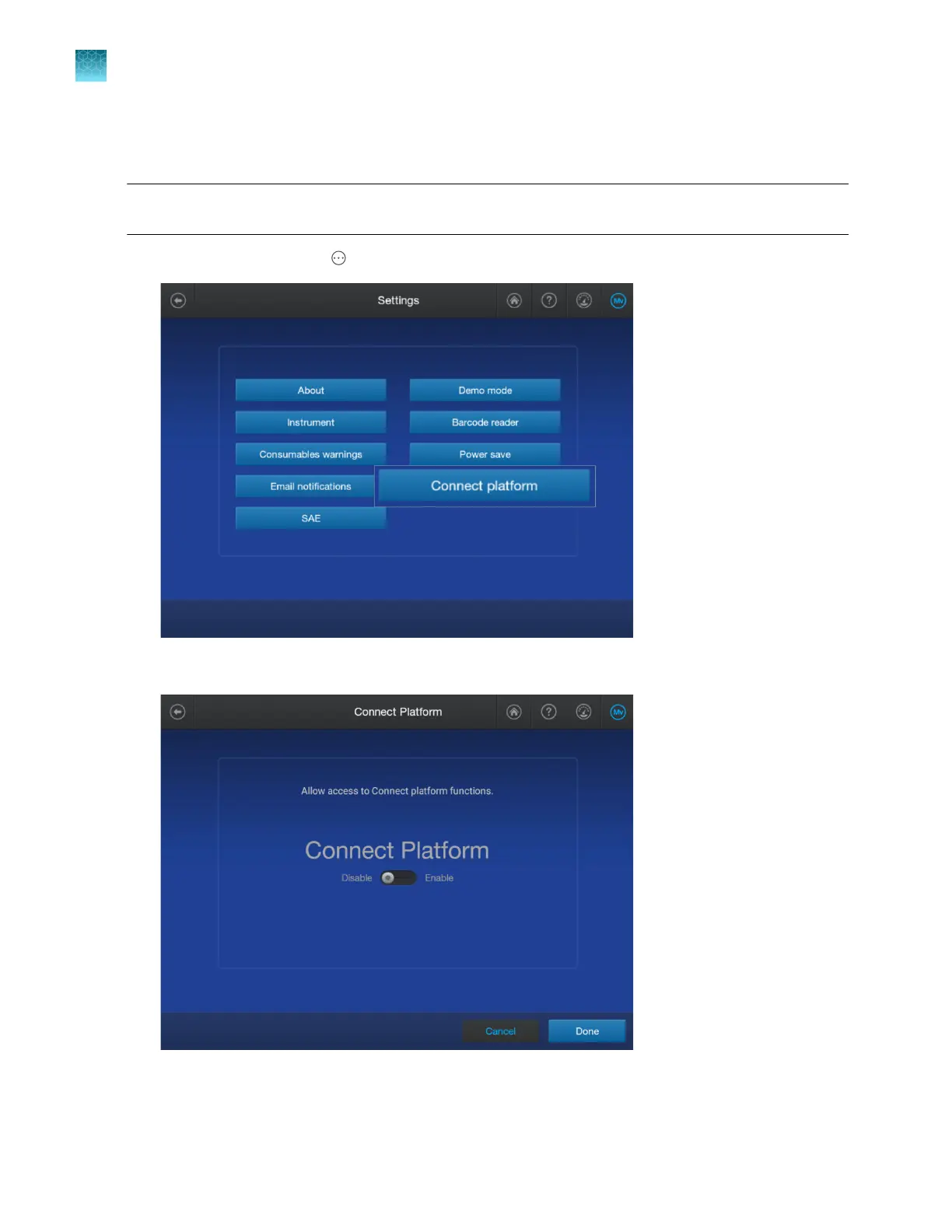 In the home screen, tap Actions4Settings4Connect platform.
