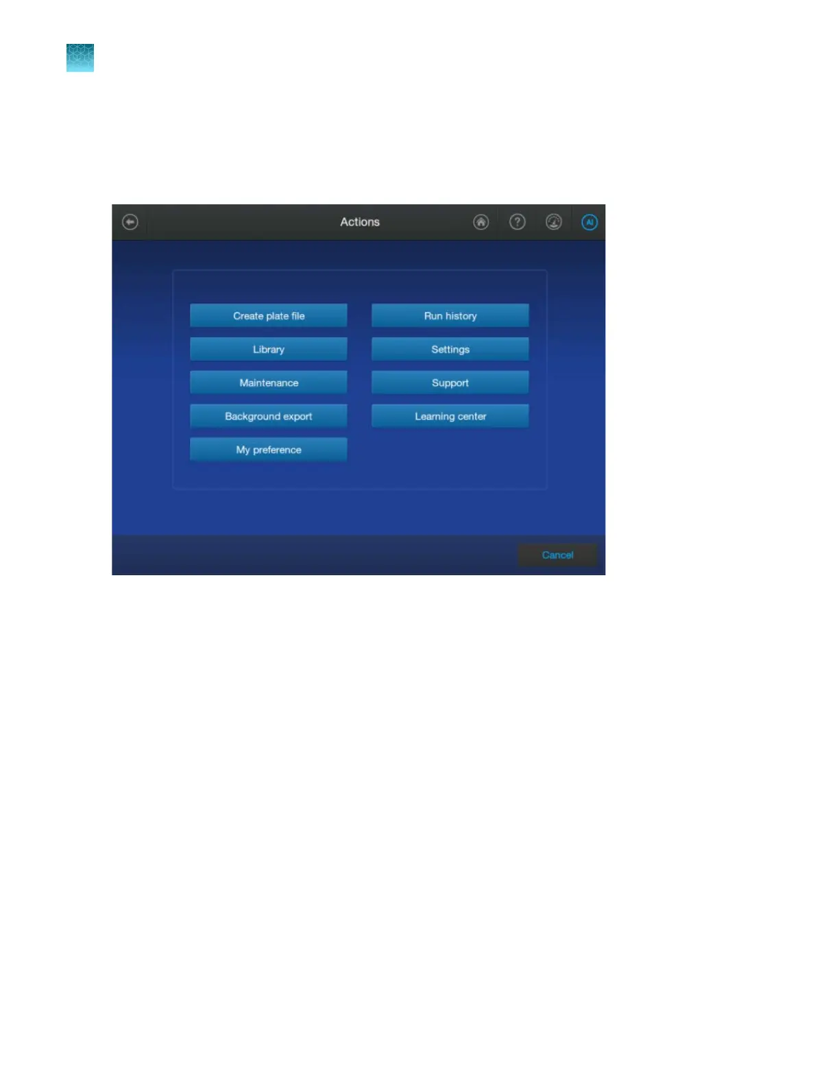The Actions screen provides access to most functions in the software other than running plates and