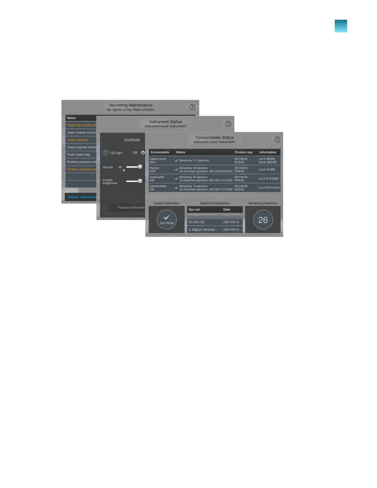 Dashboard screens—Instrument Status, Consumables Status, and Upcoming