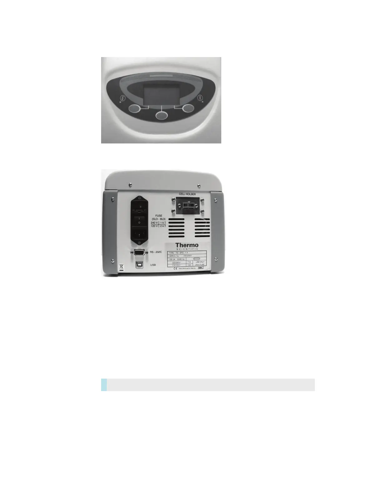 The rear panel houses the main power connection with voltage selector, RS-232 and USB