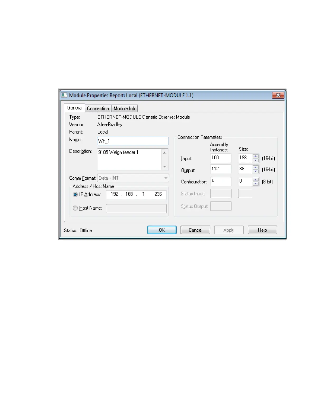 An example of the Ethernet Module Properties information is shown