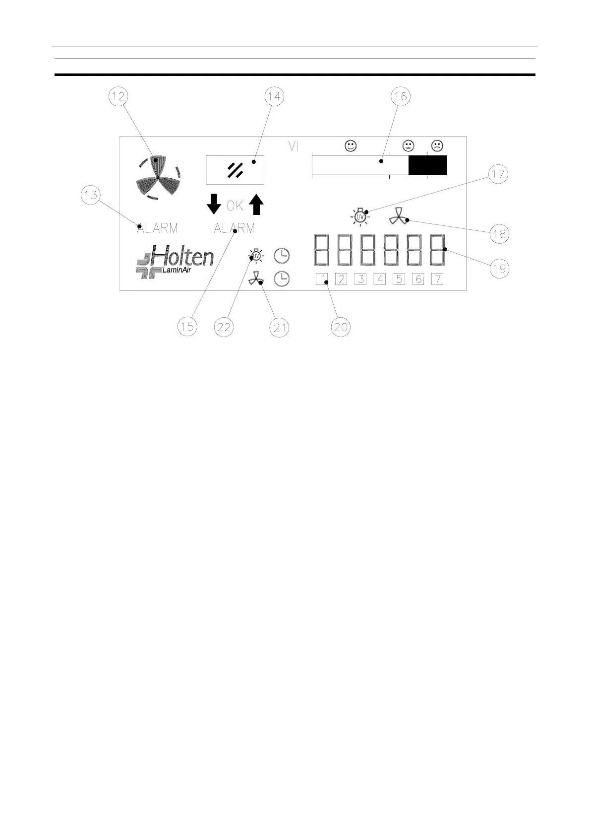 16. Indication of vertical air velocity in the work chamber (service meter).