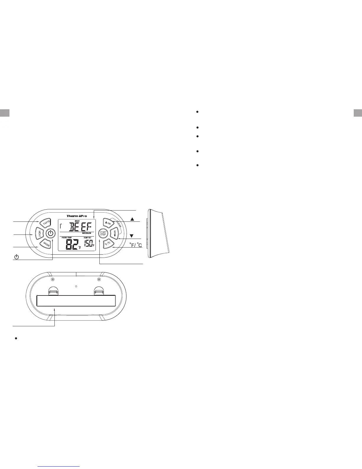 1. MODE – Press to select thermometer or timer mode.