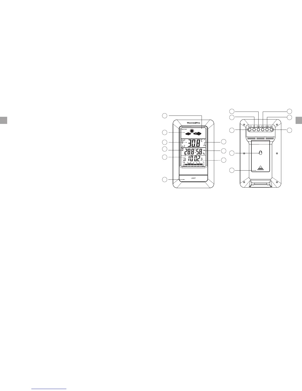 1. LCD display: Displays the current outdoor temperature, indoor humidity/