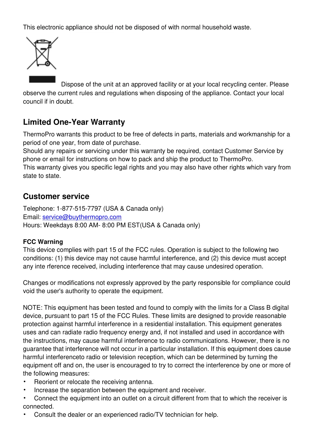 ThermoPro warrants this product to be free of defects in parts, materials and workmanship for a