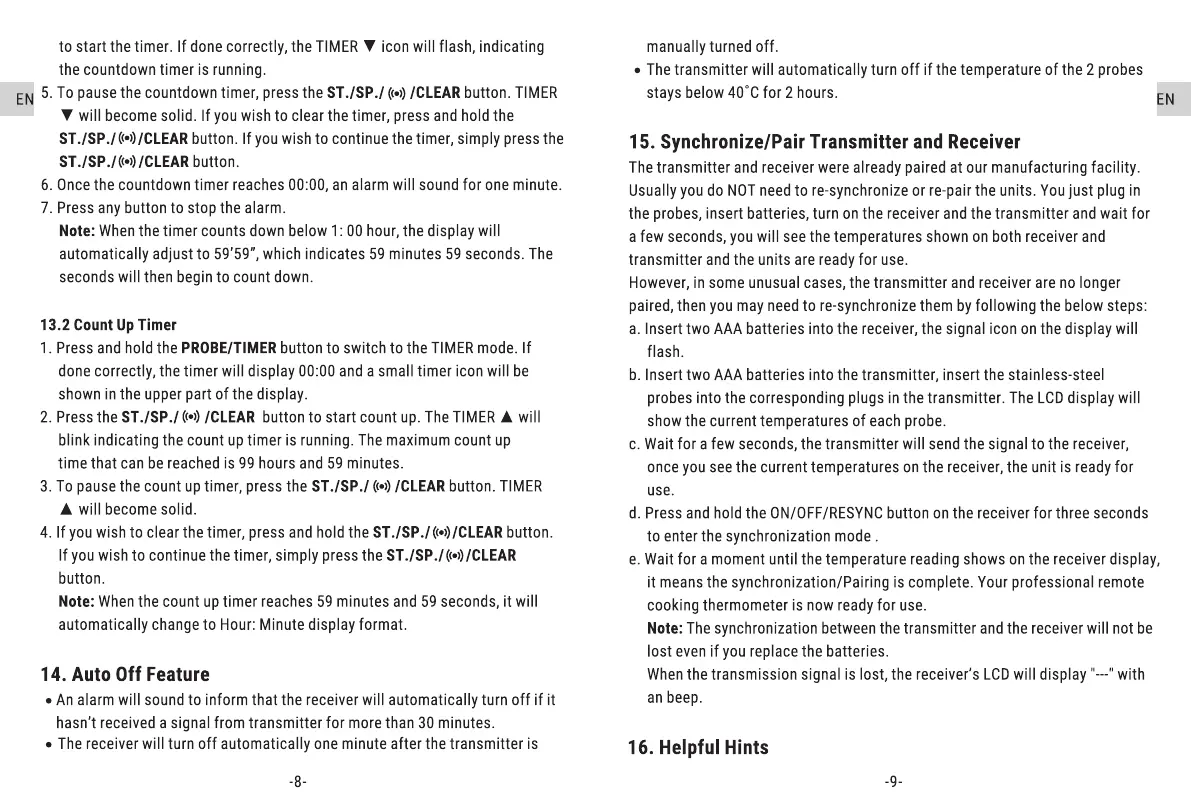 ThermoPro TP828B - Count Up Timer; Auto Off Feature; Synchronize;Pair Transmitter and Receiver; Helpful Hints